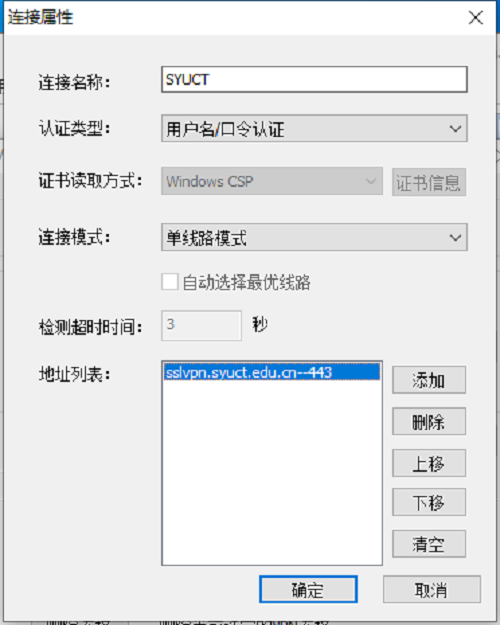 地址列表:点击右侧“添加”按钮(如图五),输入VPN地址:sslvpn.syuct.edu.cn(推荐使用)或直接填写IP地址:218.24.73.137,端口号默认:443,确定并退回主界面。