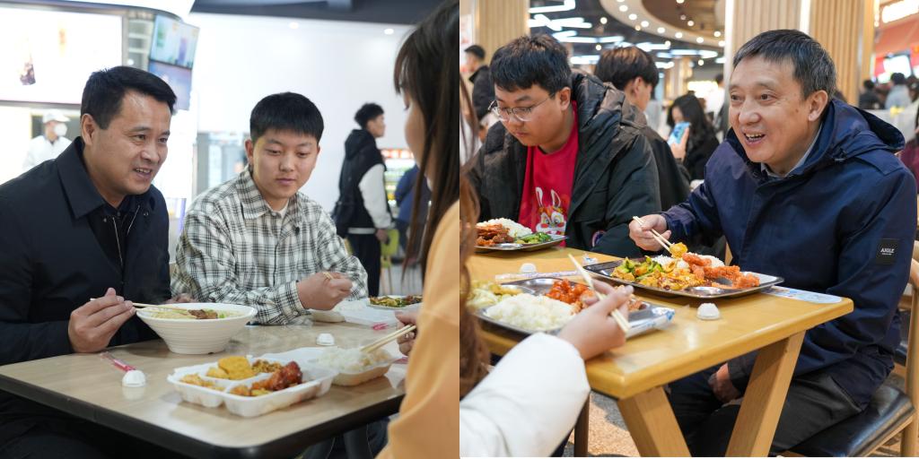 中午12时,校领导们来到食堂与同学们共进午餐。