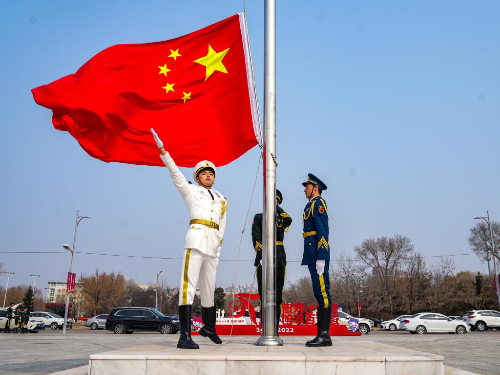 12时40分,升旗仪式正式开始。在庄严肃穆的氛围中,五星红旗伴随着雄壮的《义勇军进行曲》冉冉升起。全场师生庄严肃立,面向五星红旗行注目礼,齐声高唱国歌。