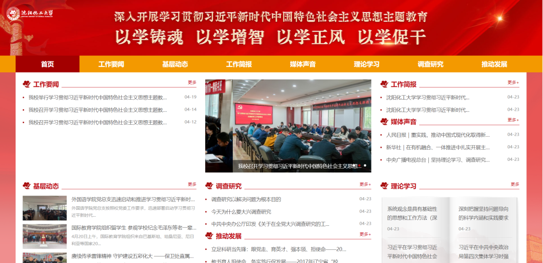 网站设有“工作要闻”“基层动态”“工作简报”“媒体声音”“理论学习”“调查研究”“推动发展”七个专栏。其中,“工作要闻”旨在实时报道学校部署开展主题教育的整体情况和重要活动进展;“基层动态”主要汇聚学校开展主题教育的动态情况、工作举措等;“工作简报”是对主题教育相关工作进行阶段性总结;“媒体声音”发布权威媒体有关主题教育的专家解读内容;“理论学习”主要传达习近平总书记关于主题教育的重要讲话、中央及上级部门有关文件会议精神与权威媒体的新闻报道等;“调查研究”主要集中报道学校各级领导干部调研新闻等;“推动发展”旨在展示学校近几年改革发展成果,全方位展示各单位为师生办实事情况,同时挖掘和宣传先进集体以及师生中的先进典型。