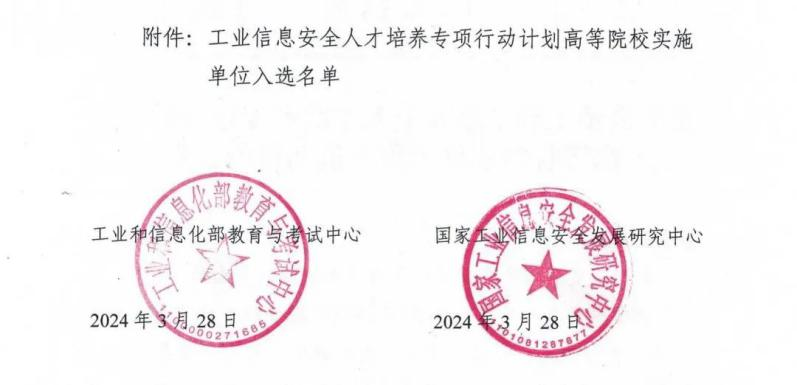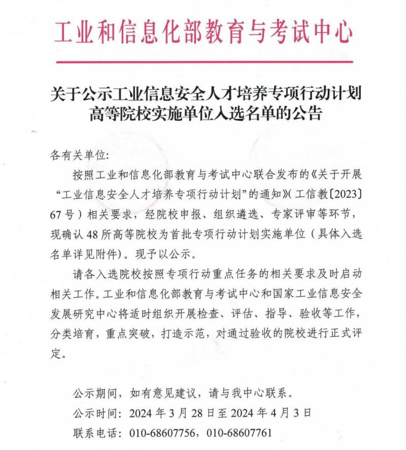 按照工业和信息化部教育与考试中心联合发布的《关于开展“工业信息安全人才培养专项行动计划”的通知》(工信教[2023]67号)相关要求,贝博官网计算机科学与技术学院在教务处的指导下,学院充分整合专业特色和学科优势,以辽宁省化工过程工业智能化技术重点实验室的技术资源为支撑,依托《网络工程》和《计算机科学与技术》两个优势特色专业完成了申报书的撰写及申报,经工信部组织答辩、专家评审,日前,工业和信息化部教育与考试中心发布《关于公示工业信息安全人才培养专项行动计划高等院校实施单位入选名单的公告》,贝博官网入选工信部首批“工业信息安全人才培养专项行动计划”高等院校实施单位。