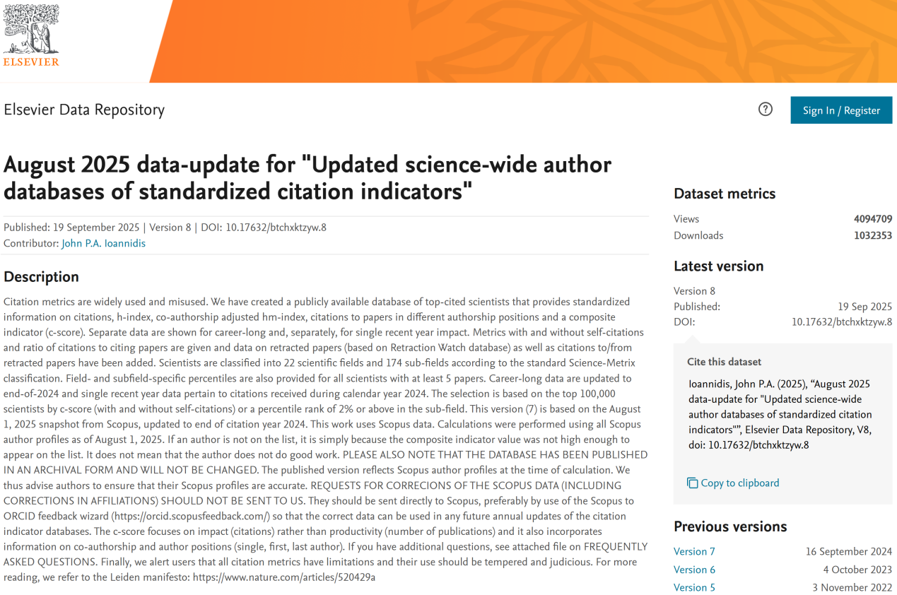 “全球前2%顶尖科学家榜单”由美国斯坦福大学联合国际学术出版社爱思唯尔(Elsevier)发布,通过Scopus数据库引用数据,采用总引用量(区分自引与他引)、H指数、HM因子等6项指标综合评估科学家的科研影响力。榜单涵盖全球近700万名科学家,遴选出排名前2%的学者,按22个主要学科领域和174-176个细分子领域分类。该榜单被视为衡量科学家长期科研表现和学术影响力的一个客观指标,入选意味着该学者在其研究领域具有较高的世界影响力。