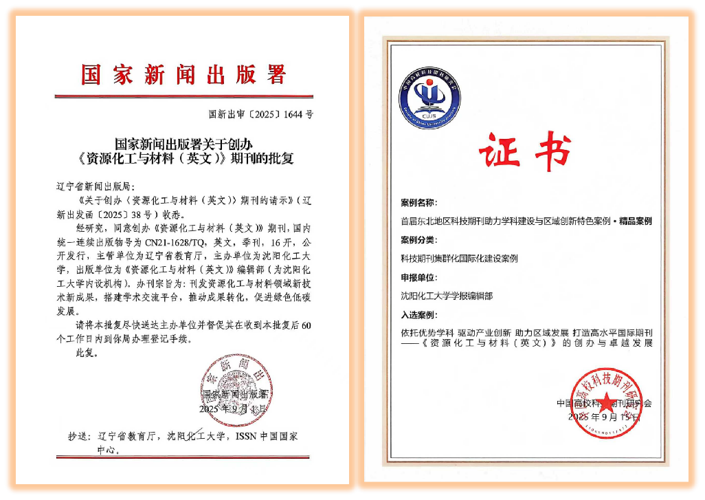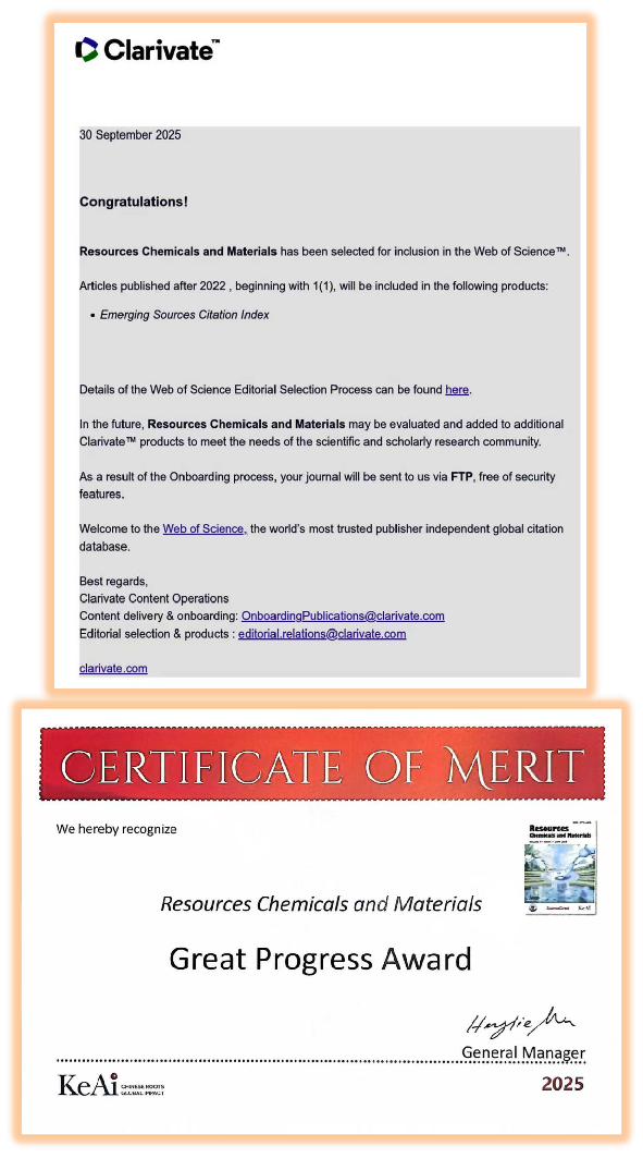 近日,由贝博官网主办的英文学术期刊《Resources Chemicals and Materials》(以下简称RCM)被Emerging Sources Citation Index(ESCI)数据库正式收录!这标志着期刊在国际化发展征程中迈出了里程碑式的一步!RCM将于2026年收获首个影响因子,跻身全球高质量学术期刊行列。