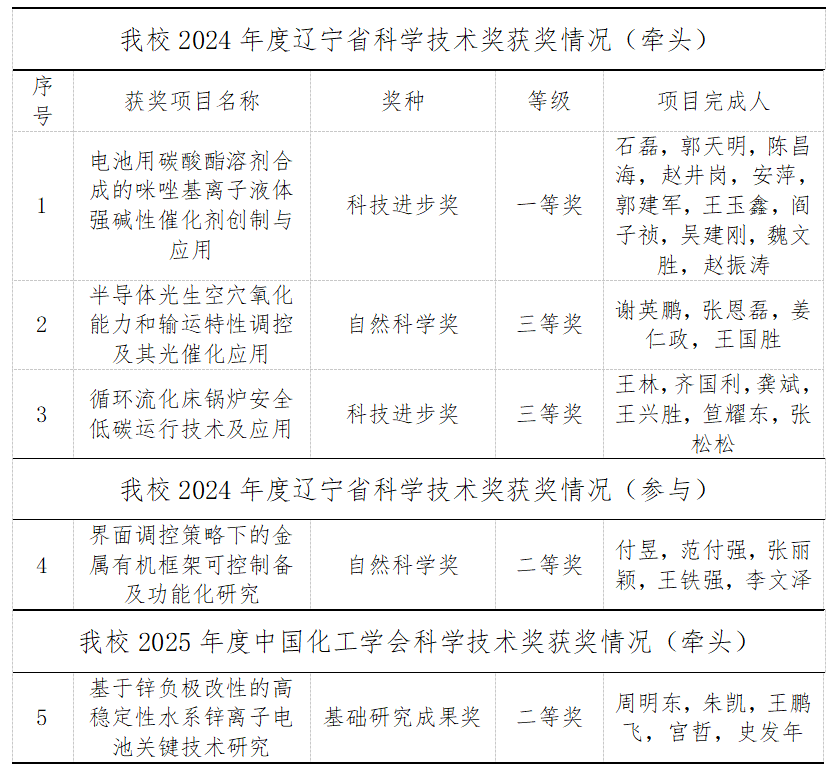 近日,辽宁省人民政府发布了《关于2024年度辽宁省科学技术奖励的决定》,贝博官网共有4项成果获奖,其中获得科技进步奖一等奖1项、自然科学奖二等奖1项、自然科学奖和科技进步奖三等奖各1项。此外,贝博官网1项成果获得2025年度中国化工学会科学技术奖“基础研究成果奖”二等奖。