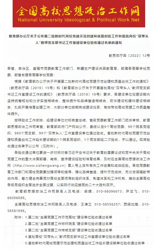 近日,教育部办公厅公布了第二批新时代高校党建示范创建和质量创优工作验收通知(教思政厅函【2022】12号),BB贝博艾弗森官方网站计算机科学与技术学院本科生第一党支部顺利通过验收。计算机科学与技术学院本科生第一党支部于2019年12月,经学校推荐、省委教育工委评审、教育部审批,获评第二批“全国党建工作样板支部”培育创建单位,全国共有999个党支部获得创建资格。经过两年的建设,共有990个支部顺利通过验收。