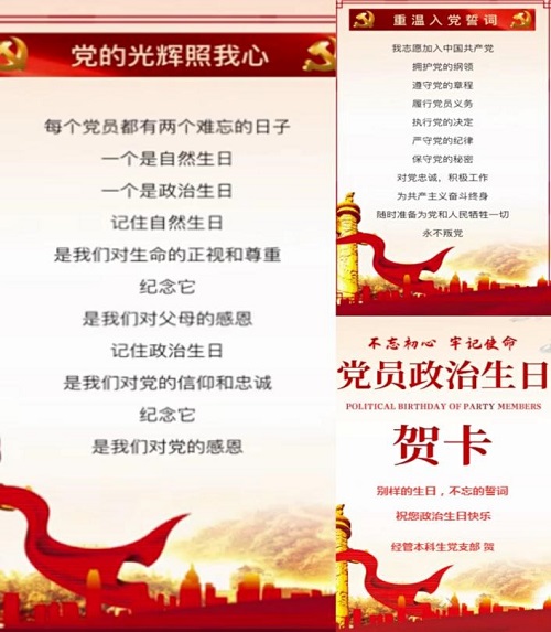 学院本科生党支部为支部全体党员同志播放集体过“政治生日”祝福视频,为党员同志制作精美的党员政治生日电子贺卡,用实际行动让支部党员同志感受党支部的关怀与温暖。