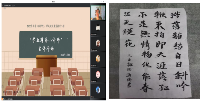 书即书画,为书画艺术之义。学院在学风建设的过程中,积极打造多平台,多模式的文化活动。“易起晒笔记”线上学习笔记征集评选活动自开始征集起,收到学院学生踊跃投稿,累计收到笔记200余份,充分展现了化工学子勤奋好学的良好学习风貌,使学风建设多元化,为其注入新的活力。书画作品的创作增添了学生们的艺术鉴赏能力,让学生进一步理解学风建设的重要含义,将以更加积极的态度和饱满的热情投入到学习生活中。