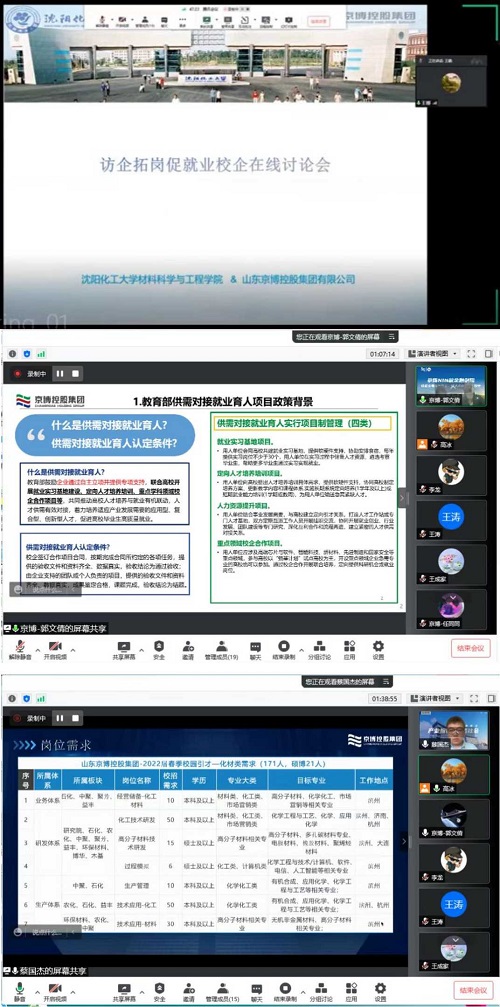 为了应对2022届高校毕业生严峻复杂的就业形势,促进毕业生更高质量就业,全面深化校企合作和人才供需对接,材料科学与工程学院率先开展了访企拓岗专项行动。4月28日上午,材料科学与工程学院与山东京博控股集团有限公司在线召开访企拓岗促就业校企讨论会。参会人员包括BB贝博艾弗森官方网站招生就业处处长王成家,材料科学与工程学院领导班子、学院各教研室主任和各年级辅导员,山东京博控股集团有限公司相关领导及部分在京博集团就业的校友。