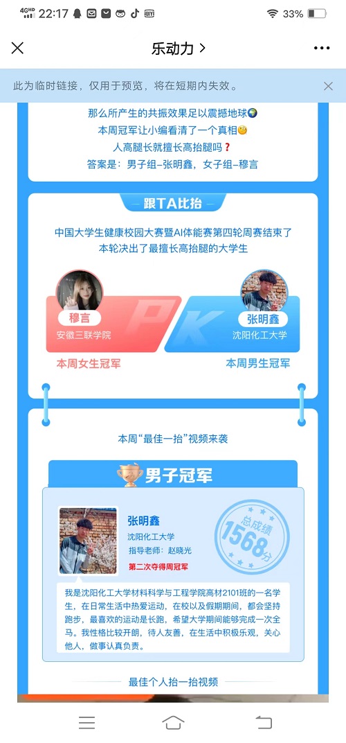 此次赛事周期从2012年12月27日开始至2022年6月5日结束,历时半年,其过程十分考验学校的组织能力和同学们的毅力。为全面提高大学生身体素质,培养其终身体育意识及顽强的意志品质,中国大学生体育协会开展了本次全国大学生AI体能大赛。体育部积极响应健康的教育理念,为了将健康素养融入体育课堂,根据当下疫情期间开展线上课教学的需求,体育部将学生公共体育课线上体能教学及课外体育锻炼与此次“乐动力”APP赛事平台有机结合,不仅完善了现有公共体育课线上教学平台,同时丰富了学生课余体育锻炼,而且教学效果显著,使公共体育课教学的创新与改革取得了新突破。