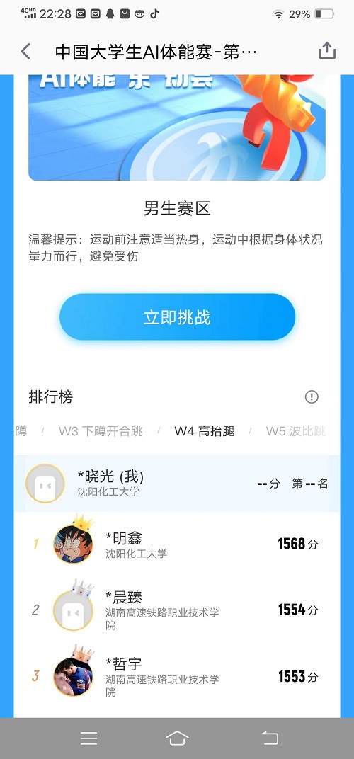贝博官网材料科学与工程学院2021级学生张明鑫同学,在中国大学生健康校园大赛暨AI体能赛第二期第二周赛事中,获得男子组个人项目深蹲动作全国第一名后,又在第二期第五周赛事中再一次获得高抬腿项目周冠军,被评为第十八周“运动之星”。 这是中国大学生健康校园AI体能大赛十八周比赛以来第一次出现个人获得两个比赛项目冠军。创造了赛会纪录,也再一次为学校争光。