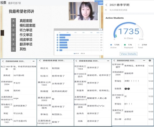 4月10日,外国语学院“四级培优”系列讲座开讲。讲座持续了两个半小时,2769名同学在线听取直播,1735名同学积极与老师在线互动。截止目前学生观看课程回放176次。