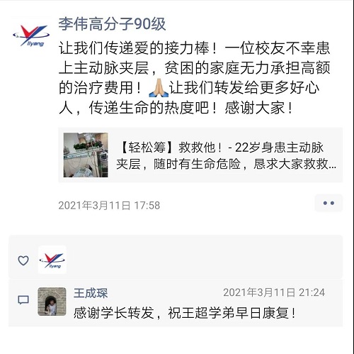 在与时间的赛跑中,化学工程学院老师积极协调,帮助王超母亲第一时间发起轻松筹募捐,化大教职工、校友、在校学生纷纷通过朋友圈、微信群转发,为王超同学捐款、加油。温暖鼓励的话语、热心真挚的祝福通过无声的文字传达,爱心的接力棒在化大人的手中交接、延伸。在不到两天的时间里有9241位爱心人士献上爱心捐款共20.27万元,为了最快时间为王超同学进行手术,轻松筹募捐通道于2021年3月12日7:30关闭。2021年3月12日,王超同学进行了长达9个半小时的手术治疗,手术效果良好。