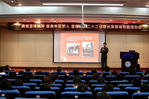 报告会上,吴锡有班长同大家一起追忆了雷锋生前的感人事迹,介绍了雷锋精神的丰富内涵,阐述了弘扬雷锋精神的时代意义。他对同学们提出了殷切期望,鼓励大家要做喜欢微笑的人、心存感恩的人、爱党报国的人。他希望全体化大青年都能当好红色传人,做好时代新人。吴班长精彩的报告博得了现场师生的阵阵掌声。