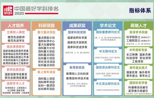 软科中国最好学科排名的指标体系包括人才培养、科研项目、成果获奖、学术论文、高端人才五个指标类别,下设16个指标维度,共计50余项反映学科竞争力的客观量化指标。排名数据全部来自权威第三方,如教育部、科技部、国家自然科学基金委员会、国际和国内文献数据库等。