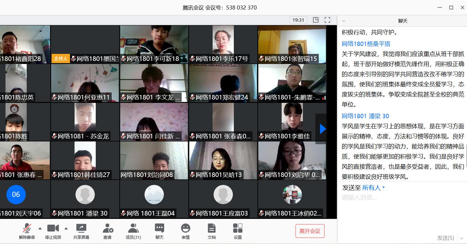 为深入贯彻落实习近平总书记对广大青年的号召“在为人民服务中茁壮成长、在艰苦奋斗中砥砺意志品质、在实践中增长工作本领”,学生党支部的21名党员分别进入到各个年级、班级的团支部,带领广大青年团员召开线上学习会议,进一步学习《习近平给北京大学援鄂医疗队全体“90后”党员的回信》精神。同学们对回信精神进行了热烈讨论,纷纷发表感想。在这次战“疫”中,“90”后用实际行动为自己正名,作为新时代大学生,应该学习援鄂医疗队中“90后”不畏艰险、冲锋在前、舍生忘死的家国大义精神,存爱党之心、立报国之志,不负韶华,让青春之光在为梦想奋斗的道路上熠熠生辉!