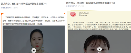 在疫情防控的关键时期,学生党支部的党员们共同发声,为武汉加油、湖北加油、中国加油!积极倡导广大同学响应国家号召,严格遵守疫情防控要求,并以公益祝福的形式,表达出对前线战士的敬意!通过支部党员来自全国各地的共同声音,一起声援武汉,鼓励疫区人民要有坚强的意志和决心,消除恐慌,理性防疫。