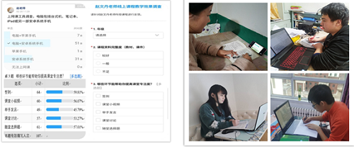 师生课堂有效互动是评价课堂质量的重要指标,信息学院广大教师积极探索线上交流互动方式。赵文丹老师通过“课前调查+课堂互动+课后跟踪”三部曲,帮助学生保质保量地掌握教学内容。利用签到、课前和课中小测、举手发言、讨论区回复等多种互动方式提高学生专注度;课间的眼保健操拉近了学生的感情,“老师太体贴了”频频出现在讨论区。为发挥网络教学的优势还搜集了许多与课程相关的小视频,布置讨论课题,提高学生参与度。她还通过问卷星+QQ群开展上课效果调查,80%以上的同学感觉听课效果好于或相当于线下课程,保证了教学质量。