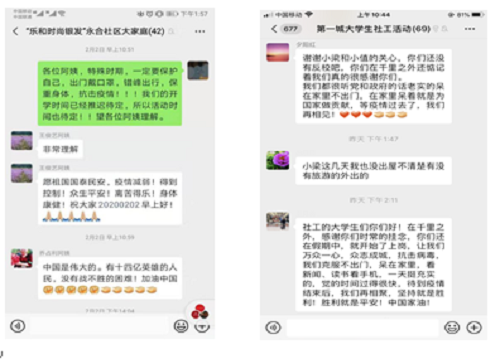 社会工作专业师生在公共场所关闭、公共娱乐停止的这个特别的时期,利用在日常服务中建立的服务对象微信群、QQ群,在群内分享关于疫情的权威报道以及如何防护疫情,加强自我防护,及时转发官方疫情发展数据和控制措施,发动社区居民做好居家安全自护。
