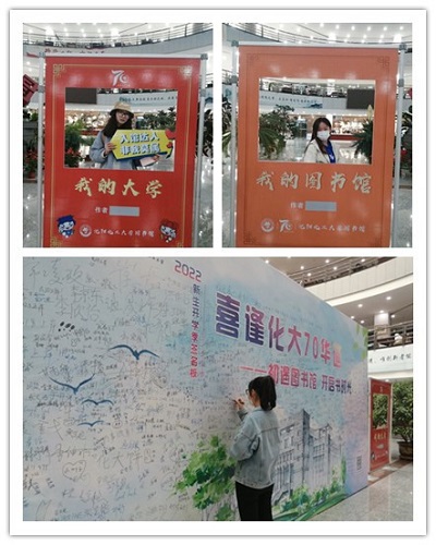 图书馆在二楼大厅展出了“喜逢化大70华诞——初遇图书馆,开启书时光”巨幅新生季签名墙,来馆的新同学们都签上了自己的名字,许下了美好愿望。