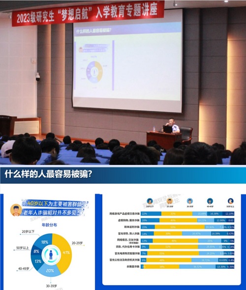 本期专题讲座分为两个阶段。首先,应保卫处邀请,沈阳市公安局新型犯罪侦查支队王峰大队长为全体2023级研究生做防范电信诈骗专题讲座。王峰队长以今年夏天最火的一部电影《孤注一掷》为切入点,从“什么样的人最容易受骗”、“骗子如何骗人之——诱之以利”、“反常识、反逻辑的事情,一定有坑”、“骗子如何骗人之——动之以情”、“骗子如何骗人之——晓之以理”等章节还原案例,以案论法,以法育人,为大家上了一堂生动的反诈安全警示课程,在强化学生自我防范意识、增强法治观念的同时,也再次重申了安全在校园生活中的重要性。