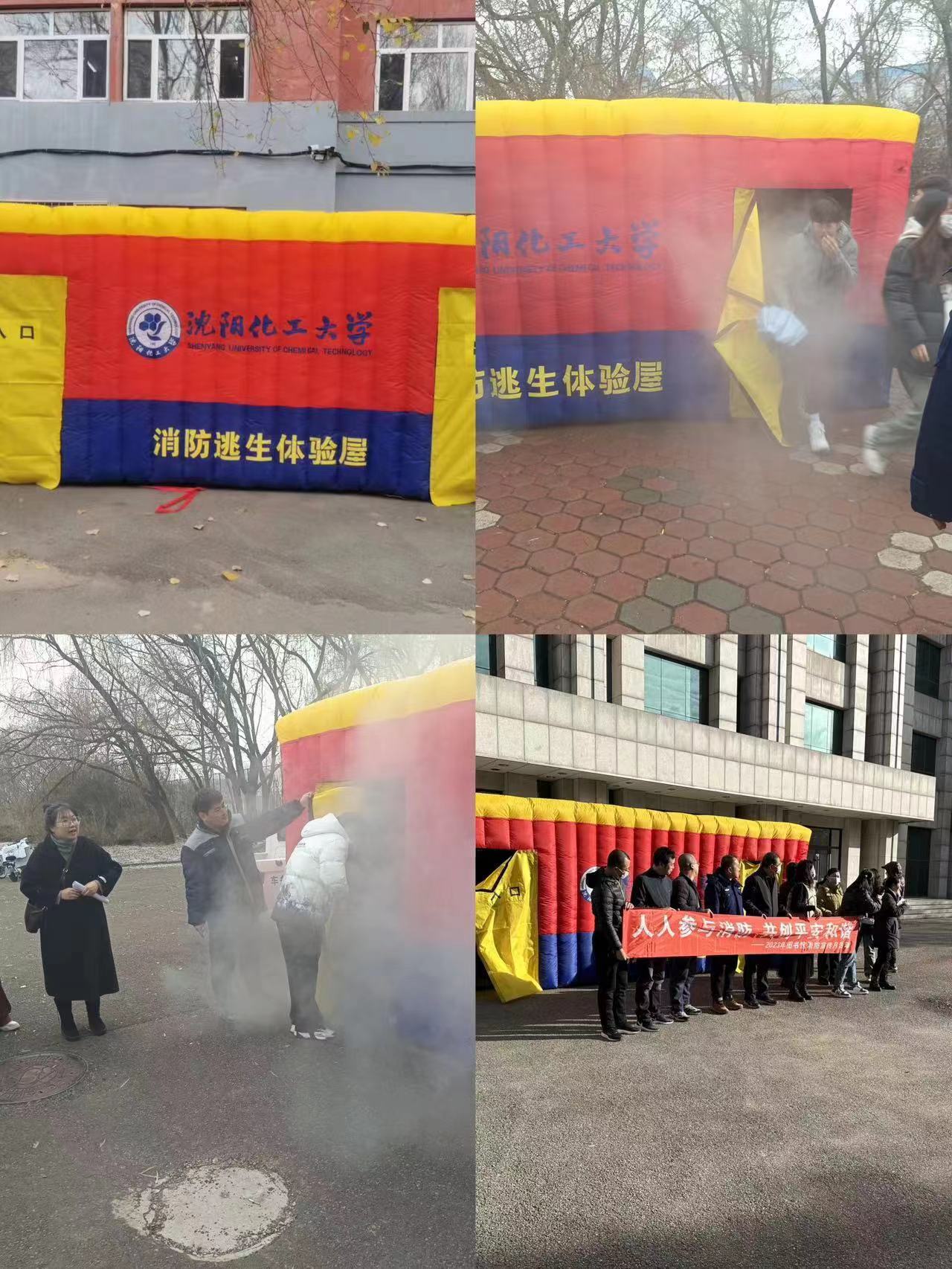 为了让师生有更深刻切实地体验,在户外操场搭建了充气“消防逃生体验屋”,模拟道路不清、视线受限等场景,最大程度模拟火灾现场,让师生切实体验真实模拟火灾逃生疏散演练。