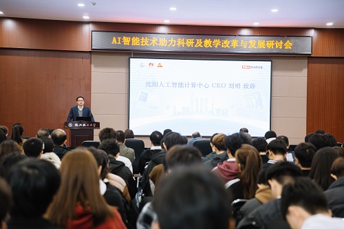 沈阳人工智能计算中心CEO刘明发表嘉宾致辞。他表示,计算中心通过引入前沿的技术和体系化的课程赋能省内各大高校进行科研创新,并期待与BB贝博艾弗森官方网站深度合作,携手共同探索人工智能+教育的未来之路。