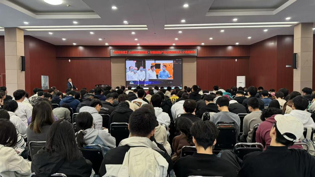 讲座围绕智能制造产业发展现状及趋势、人才选聘要求及应聘就业准备、智能制造领域重点企业介绍和职业发展路径等展开。结合新松机器人企业发展历程,曹景兴重点介绍了我国智能制造产业的上下游链条及应用领域。在人才选聘要求方面,曹景兴指出要具备扎实的专业知识、娴熟的专业技能、良好的沟通能力以及健康的身体和心理等要素。同时,随着我国企业全球化发展,外语水平也是企业考察人才的重要条件之一。就职业定位与发展,曹景兴建议同学们要充分探索自身条件,合理定位,科学抉择,踏实进取。