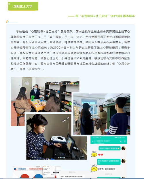 学校组成“心理疏导+社工支持”服务团队,面向全校学生和全省市民开展线上线下心理疏导与社工支持工作,用“爱”服务,用“心”守护。学校全面开展了学生心理问题或隐患排查,及时识别重点人群,分级分类,精准教育疏导;教师深入宿舍关心关爱学生,通过心理沙盘陪伴学生心灵成长;为2000余名本科生与研究生开设了线上心理健康课;积极参与辽宁高校公益心理援助平台,通过多项心理援助举措帮助本校及省内其他高校师生解决心理焦虑、困惑等问题,缓解心理压力,引导理性平和面对疫情。学校还联合沈阳市铁西区乐和社会工作服务中心,面向全省市民开通心理疏导与社工支持公益援助热线,做“心灵守护者”,开具“心理妙方”。