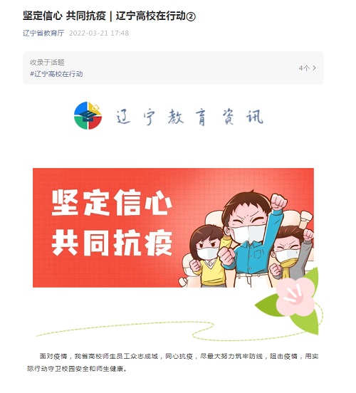 3月21日,人民网、中新网客户端、辽宁省教育厅官方公众号以《坚定信心 共同抗疫 辽宁高校在行动》为题报道省内高校师生员工众志成城,同心抗疫情况,报道中转发贝博官网《用“心理疏导+社工支持”守护校园 服务城市》特色做法。