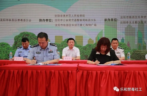 启动仪式上,铁西区禁毒委主任、区委常委、区委政法委书记曲廷会,铁西区禁毒委常务副主任、副区长、公安分局局长鄂继怀,向承接铁西区禁毒社会化服务工作的贝博官网乐和社会工作服务中心等单位授旗、授匾。贝博官网人文与艺术学院院长陈晓东和铁西区禁毒办主任、公安分局副局长朱为华代表BB贝博艾弗森官方网站人文与艺术学院和沈阳市铁西区禁毒委员会办公室共同签署了“禁毒社会工作合作框架协议”。贝博官网社会工作教研室主任杨明伟向与会领导介绍了BB贝博艾弗森官方网站开展禁毒社会工作研究的情况。活动现场,乐和社工中心向与会领导和各界群众介绍了展示的毒品模型,呼吁公民积极抵制毒品,营造“健康人生,绿色无毒”的环境。