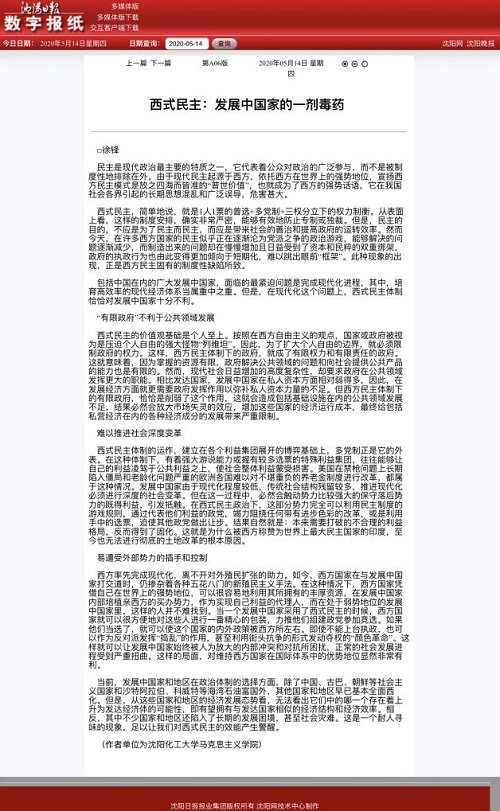 5月14日,贝博官网马克思主义学院特色理论教研室主任徐锋副教授在《沈阳日报》理论版发表题为《西式民主:发展中国家的一剂毒药》的理论文章。文章针对宣扬西式民主的错误社会思潮,鲜明指出西式民主体制对包括中国在内的广大发展中国家而言有害无利。徐锋副教授从西式民主的“有限政府”不利于公共领域发展、难以推进社会深度变革、西式民主使发展中国家更易遭受外部势力的插手和控制三个方面论述了西式民主对发展中国家的不利因素。文章指出,从已经西化的发展中国家和地区的经济发展态势看,均不存在上升为发达经济体的可能性,相反,其中不少国家和地区还陷入了长期的发展困境,甚至社会灾难。这是一个耐人寻味的现象,足以让我们对西式民主的效能产生警醒。