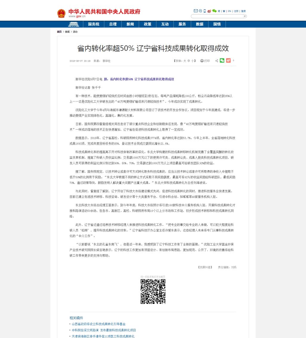 97日,国务院网站刊登新华社记者张千千采写的新闻《省内转化率超50% 辽宁省科技成果转化取得成效》。该新闻对贝博官网“40万吨菱镁矿输送床闪速轻烧技术”在海城落地事宜进行了报道。现将该新闻转载如下: