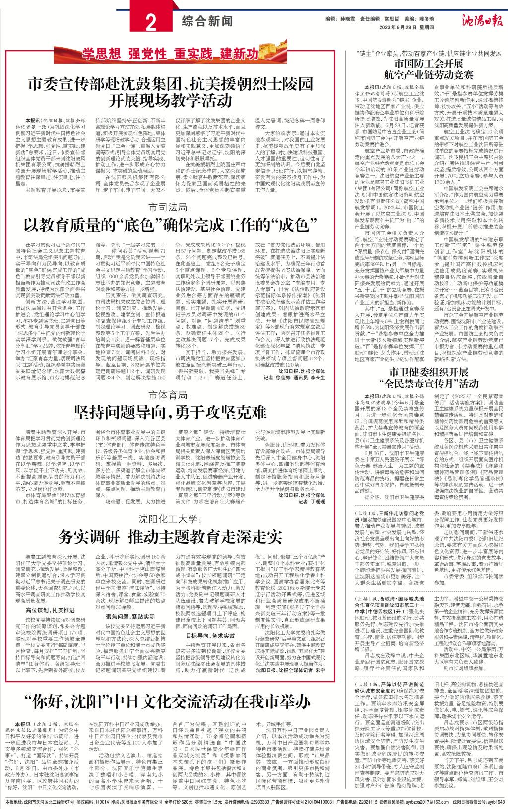 目标导向,务求实效。主题教育开展以来,省市各级领导多次到校调研,该校党委坚持把各级领导意见建议转化为服务辽沈经济社会发展的具体措施,助力打赢新时代“辽沈战役”。同时,学校聚焦“三个万亿级”产业,调整10个本科专业;获批“化工报国”辽宁科学家精神教育基地;成功召开工程热化学香山科学会议,圆满举办首届东北高等教育论坛、2023俄罗斯院士专家辽宁行活动开幕式等,促进区域和行业高质量研究成果不断涌现。制定实施《服务辽宁全面振兴新突破三年行动方案》等一批制度性文件,真正形成调研成果应用的长效机制。