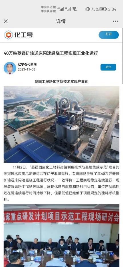 11月2日,“菱镁固废化工材料高值利用技术与基地集成示范”项目的关键技术应用示范研讨会在辽宁海城举行。专家现场考察了年40万吨菱镁矿输送床闪速轻烧工程运行状况,一致评价:工程实现稳定连续运行,现场装置无粉尘飞扬等现象,展现优良的燃烧和热利用状态,单位产品能耗还在随连续运行时间持续下降,但最低值已经低于项目规定的能耗考核指标。“年40万吨级菱镁矿输送床闪速轻烧示范工程”被列为辽宁省菱镁产业升级和技术改造重点示范项目,成功入选国家重大建设项目库,并获批国家发展改革委产业创新链整合项目、辽宁省“揭榜挂帅”和“打通计划”项目。
