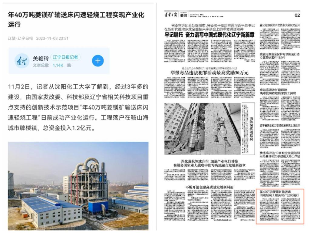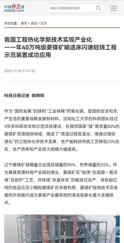 11月6日,《科技日报》头版以“我国工程热化学新技术实现产业化 年40万吨级菱镁矿输送床闪速轻烧工程示范装置成功应用”为题对贝博官网40万吨菱镁矿输送床闪速轻烧工程实现工业化运行进行了报道。