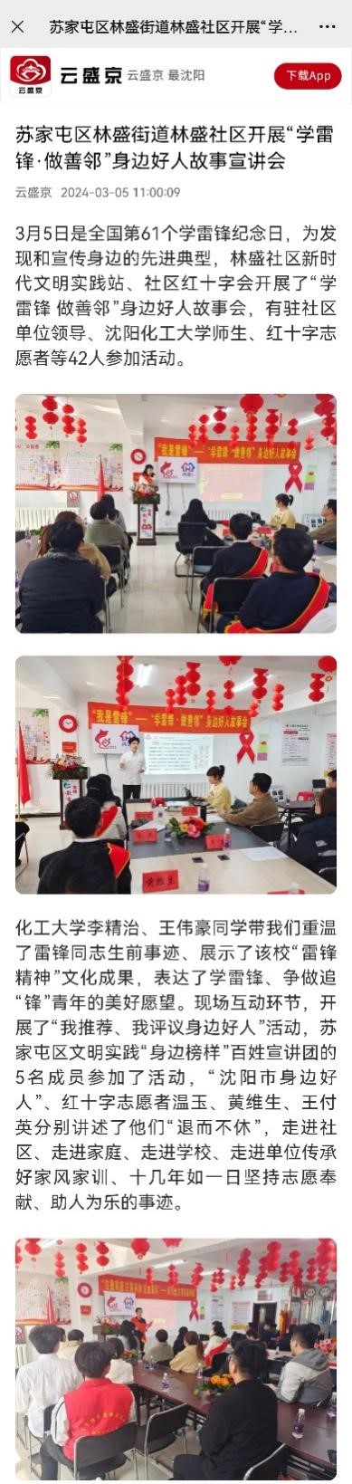 3月5日是全国第61个学雷锋纪念日,为弘扬好人精神,及时发现和宣传身边的先进典型,人文与艺术学院团委书记带领社会工作专业近20名本科和研究生同学赴苏家屯区林盛社区新时代文明实践站、社区红十字会开展了“学雷锋 做善邻”身边好人故事会,有驻社区单位领导、红十字志愿者等42人参加活动。本次活动获得了云盛京客户端、今日头条辽网官方账号等多家媒体的报道和转载。