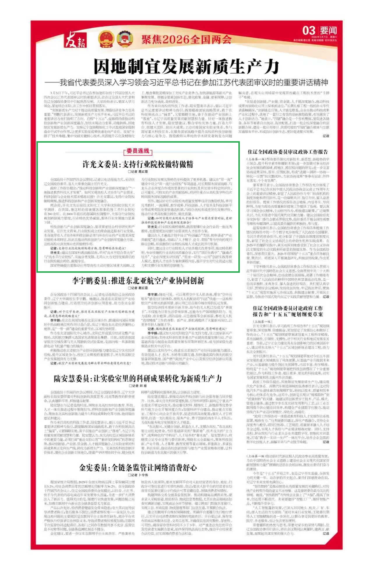 政府工作报告提出:“推动科技创新和产业创新深度融合”“一体推进教育科技人才发展”。如何实现高校人才培养与产业需求、科研创新与企业技术需求精准对接?许光文建议,支持行业院校做特做精,推进科技创新和产业创新深度融合。