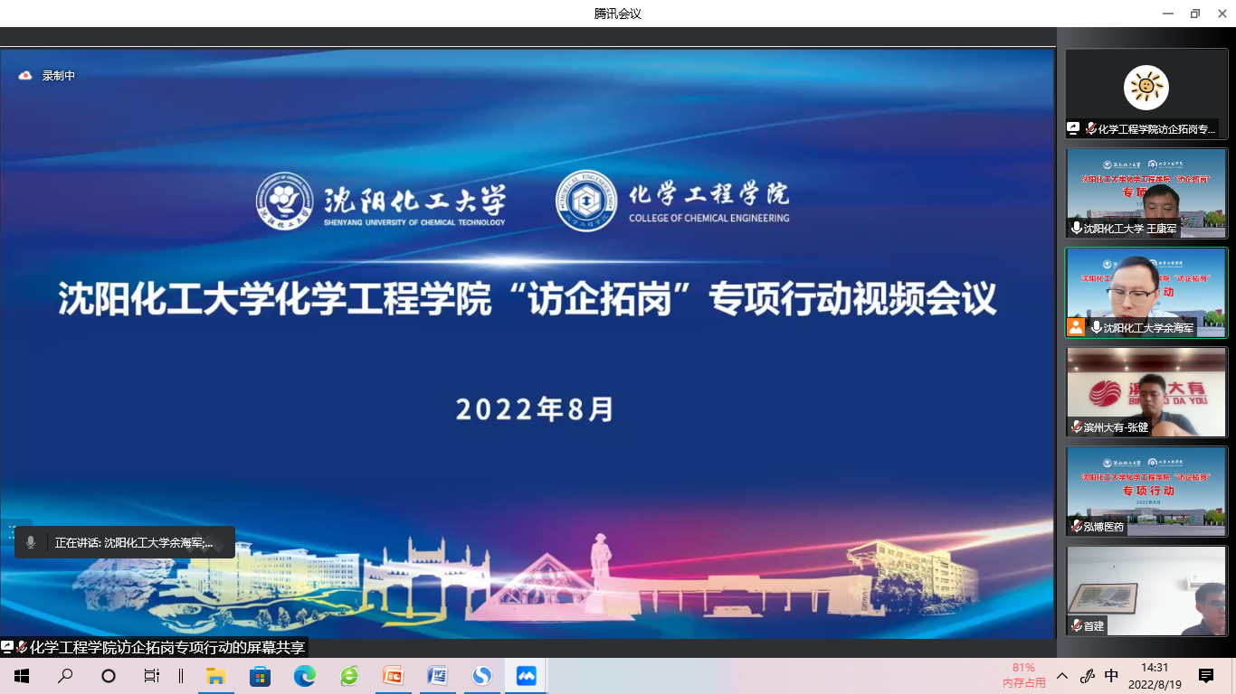 为贯彻落实党中央、国务院关于高校毕业生就业工作的决策部署,严格贯彻落实辽宁省教育厅有关“访企拓岗”的文件精神和BB贝博艾弗森官方网站“访企拓岗”工作要求,加快健全毕业生市场化社会化的就业创业工作机制,开拓更多就业创业岗位和机会,8月19日,化学工程学院举办首次云端“访企拓岗”专项行动对接会。旭阳集团有限公司、首建农业集团有限公司、卫星化学股份有限公司、凯莱英医药化学技术有限公司、山东昌邑家园化工有限公司、宁波美诺华药业股份有限公司等20余家大型化工类企业代表参加了这次专项行动对接会。