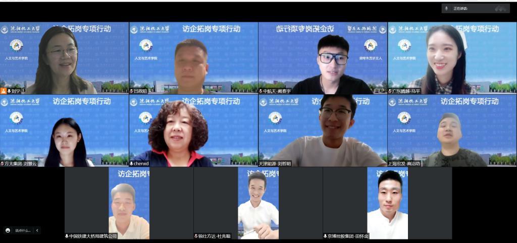 为落实2022届毕业生就业工作,人文与艺术学院于8月23日组织召开访企拓岗专项行动引企入校线上交流会。会议邀请了中国铁建大桥工程局集团建筑公司、中航天建设工程集团有限公司三公司、广东腾越建筑工程有限公司等8家企业参会。人文与艺术学院院长陈晓东、党委书记吕政阳、党委副书记刘宁\相关专业教研室主任及全体辅导员参会。会议由人文与艺术学院党委副书记刘宁主持。