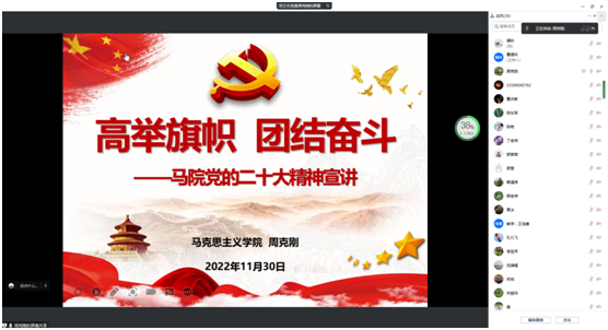 11月30日党总支书记周克刚向马院全体教师进行了深入学习贯彻党的二十大精神宣讲。宣讲内容紧扣“五个牢牢把握”、“七个聚焦”,着力增强学习贯彻的系统性。结合学校“十四五”发展规划、第二次党代会精神和思想政治教育等工作实际,不断凝聚共识、着力增强学习贯彻的实效性。并且,此次宣讲对马院理论宣讲团讲师及全体教师学习宣传贯彻党的二十大精神提出了具体要求。