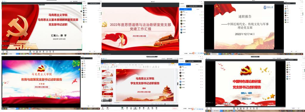 为进一步学习贯彻落实习近平新时代中国特色社会主义思想和党的二十大精神,加强基层党组织建设,12月14日下午,马克思主义学院党总支开展线上2022年度基层党支部书记抓党建工作述职大会。会议由党总支书记周克刚主持,学院党总支委员和党支部书记参加了本次大会。