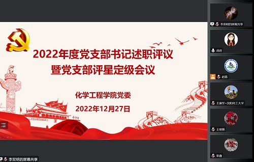 12月27日18点30分,化学工程学院党委在线上召开2022年度党支部书记述职评议暨党支部评星定级会议。党委委员、领导班子、各党支部书记、教师代表参加会议,会议由学院党委书记战君书记主持。