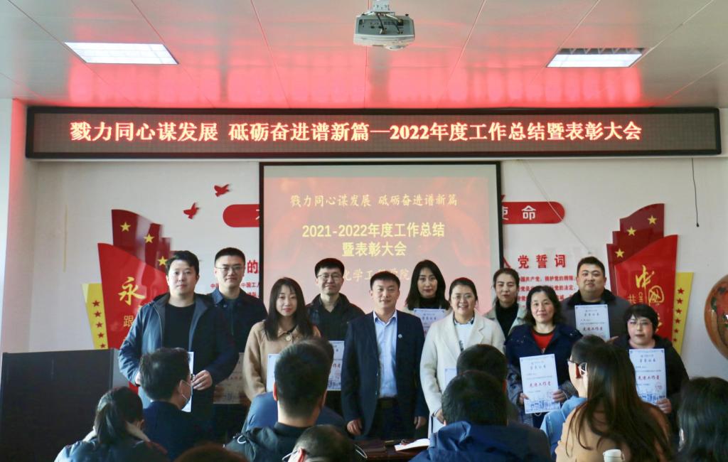 党委书记战君代表学院党政领导班子感谢全院师生2022年凝心聚力、奋楫笃行,为学校和学院的高质量发展做出贡献,并宣读2022年以来获得省市校荣誉称号和奖励的集体和教师名单。党委副书记余海军宣读了化学工程学院表彰决定。学院领导班子为获得学院先进工作者、优秀党务工作者、疫情防控先进个人、青教技能大赛先进个人、招生就业工作先进个人及文体活动先进个人荣誉的教师颁发荣誉证书。