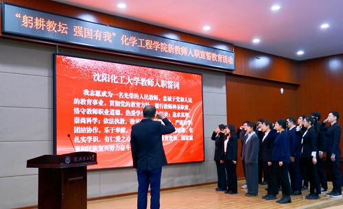 会议同时开展了“躬耕教坛,强国有我”——化学工程学院党委新教师入职宣誓教育活动。张志刚教授带领学院新入职的15名教师进行了庄重宣誓。近年来,学院深入实施青年教师导师制度,通过新老教师结对子,加强对青年教师思想与能力的“双引领”,实现青年教师教学科研水平和思想道德水平的“双提升”。