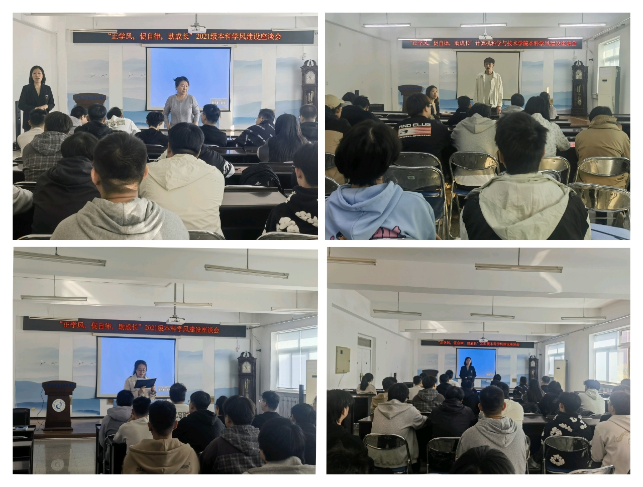 辅导员张英、易柏言、周莹莹分别围绕学业现状、毕业审查条件、学业预警重要性展开介绍。同学们对自己挂科的原因、目前存在的学习的困难与老师们进行了交流。教学秘书赵司宇针对重修报名、降级生选课等注意事项为同学们进行了详细说明和介绍。