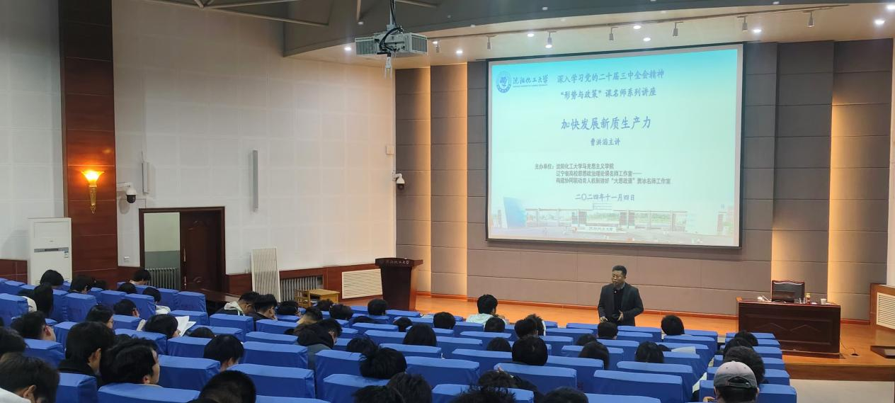 11月4日,由马克思主义学院、辽宁省“构建协同育人机制讲好‘大思政课’贾冰名师工作室”主办的深入学习贯彻党的二十届三中全会精神“形势与政策”课名师系列讲座第五讲在碧帆楼304报告厅顺利举办。本次讲座邀请东北大学党委宣传部副部长、马克思主义学院教授、博士生导师曹洪滔主讲,主题为“加快发展新质生产力”。化学工程学院400余名师生代表聆听了本次讲座。
