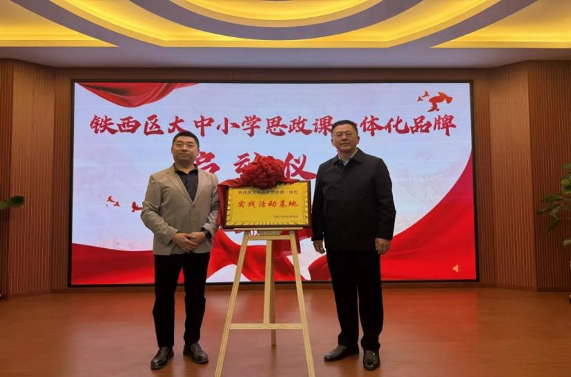 马克思主义学院党总支书记王成家、铁西区教育局德育科科长朱凯为“铁西区大中小学思政课一体化实践活动基地”揭牌。