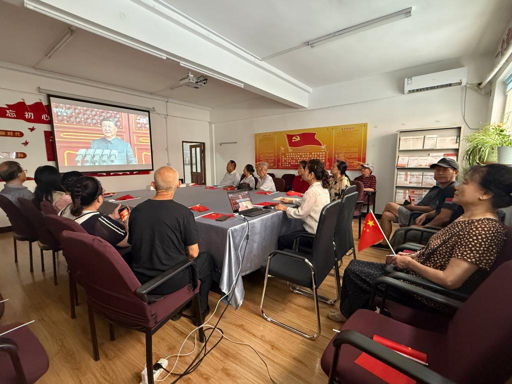 观看过程中,老同志们全神贯注,被整齐的方阵、先进的武器装备深深震撼。现场气氛庄重而热烈,不少人手中挥舞着鲜艳的五星红旗。当礼炮轰鸣,国歌奏响时,全体老同志自发起立,高唱国歌,他们身姿挺拔,目光坚定,脸上写满了对祖国的热爱与敬意。