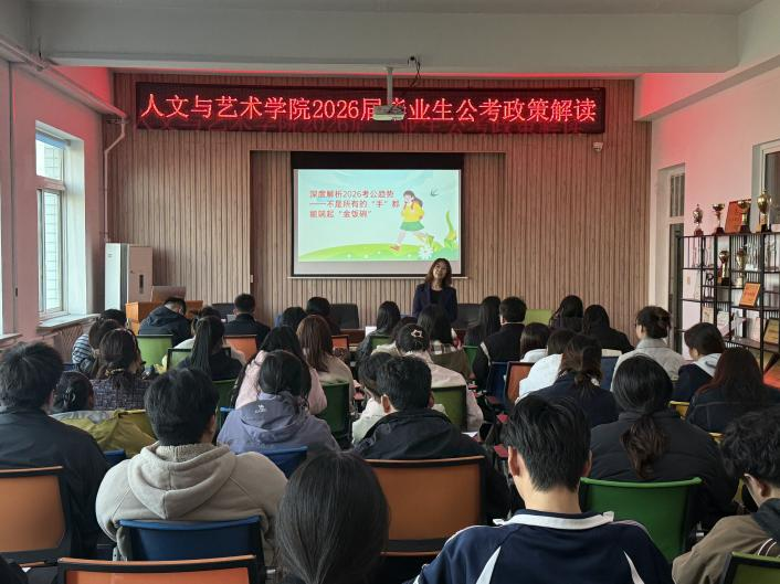 于丰刚根据近几年就业形势和我院实际就业情况,与大家进行了相关经验和信息分享。本次公考政策解读专题讲座,不仅为我院报考同学在结合自身优势找准报考方向在备考路上提供方向,也为人文与艺术学院涵养优良学风、营造“目标明确、科学备考”的积极氛围注入了强劲动力。