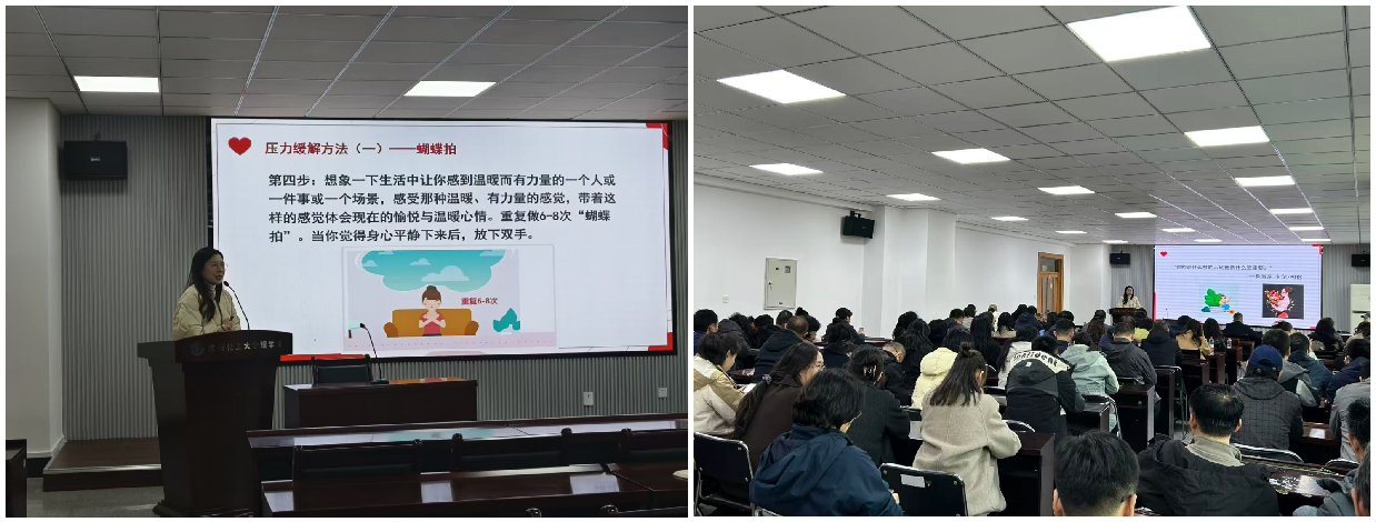 本次讲座特别邀请马克思主义学院专职心理教师安慧子主讲。她以《“师”放压力,从“心”出发》为主题,紧密围绕教职工的工作实际与心理需求展开。通过生动的案例与专业的心理学知识,帮助教职工正确认识压力,打破对压力的认知误区,并结合自身研究与实践经验,分享了一系列实用的情绪管理与压力应对方法。